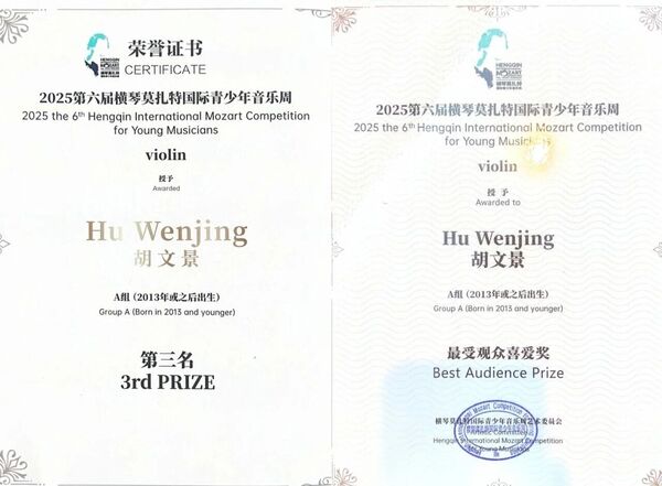 近日,2025第六屆橫琴莫扎特國際青少年音樂周落下帷幕,浙江音樂學(xué)院室內(nèi)樂學(xué)院少年班學(xué)員胡文景(Wenjing Hu)憑借出色的表現(xiàn),榮獲小提琴A組(2013年及以后出生)第三名和最受觀眾喜愛獎。這是他繼2023年柯崗國際小提琴比賽三等獎、2024年比利時格魯米奧國際小提琴比賽第二名之后,再次在國際舞臺上獲得優(yōu)秀成績。這一成績也充分展現(xiàn)了室內(nèi)樂學(xué)院在青少年音樂人才培養(yǎng)方面的系統(tǒng)化教學(xué)成果。